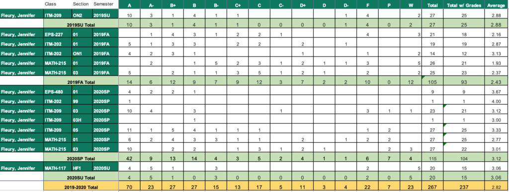 A chart showing my grade distribution for the courses that I taught during the 2019-2020 school year are shown below.