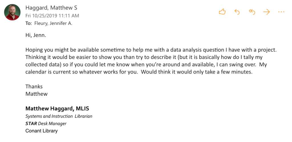 It is common for my colleagues to call on me for technical (or other) support. Whenever I am able, I try to assist them. Examples of requests are included below.